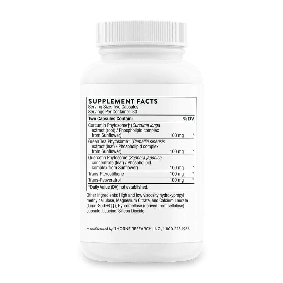 Resveratrol is one of the best absorbed polyphenols (antioxidants naturally occurring in plants) you can feed your body and humans have been seen to lack free Resveratrol in the blood stream. It helps with a number of our main health concerns including anti-aging, detoxification, fat-burning, cancer prevention, infection fighting and protecting the brain from degeneration and stroke. It provides powerful antioxidant and anti-inflammatory effects causing your cells to self-clean and operate smoothly no matter what task you undertake. Thorne’s Polyresveratrol-SR has been formulated for maximum resveratrol absorption and metabolism by co-supplementing with the following:Â